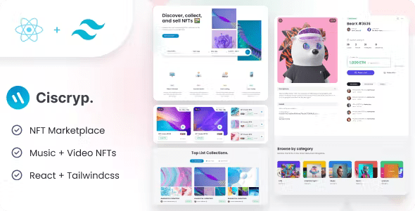 Ciscryp | NFT Marketplace React Template – a responsive React template theme with NFT Marketplace and NFTs Store. Ciscryp is built by the latest React typescript and tailwindcss.
